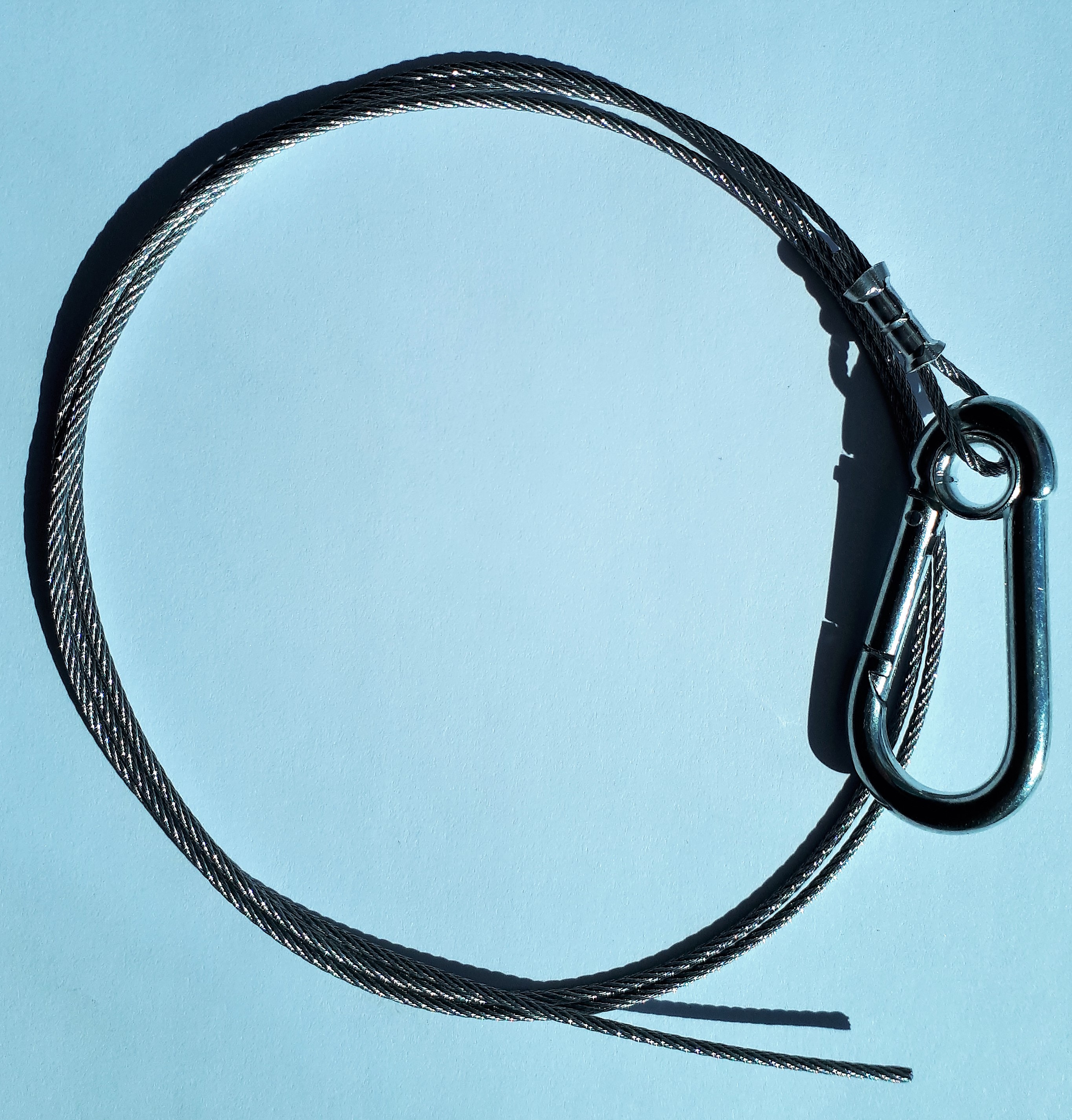 Câble d'acier 1/16'' assemblé avec un mousqueton à un bout. 4' de long.